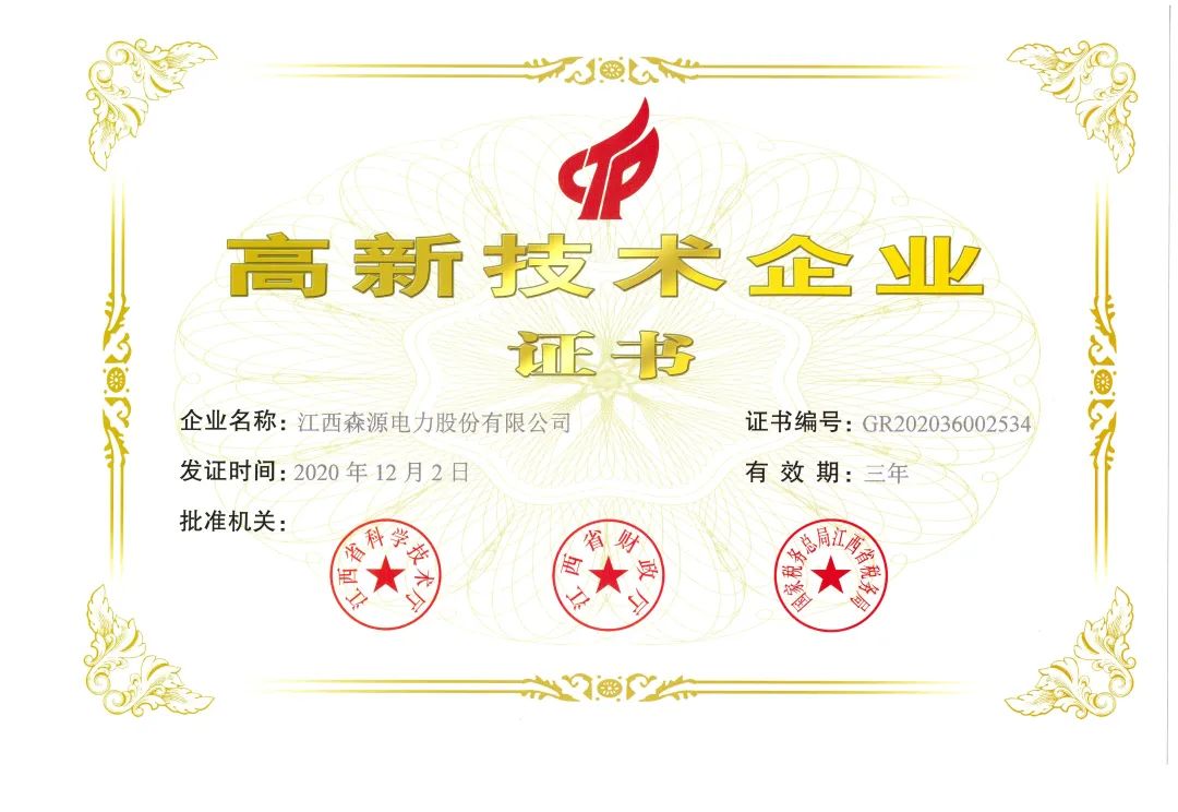 近日,江西森源電力股份有限公司榮獲國家高新技術(shù)企業(yè)認(rèn)定。